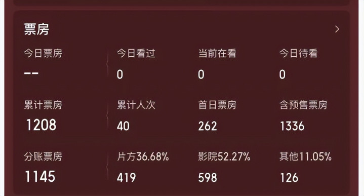 上映10天,仅40个不雅众,总票房1208元,片方分账419元。这何啻是2月份最惨的新片,2026年最惨电影降生了啊。