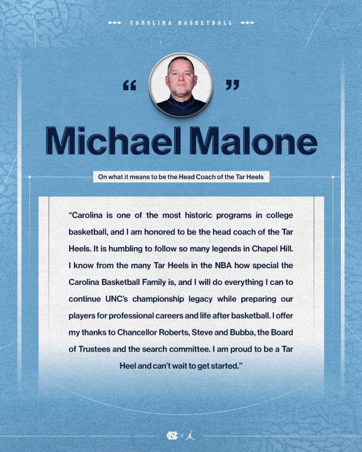 虎扑04月08日讯北卡罗来纳大学男篮官方书记,迈克尔-马龙出任球队新任主培植,并在酬酢媒体上发文接待其加入:“很运气领有您,培植!”