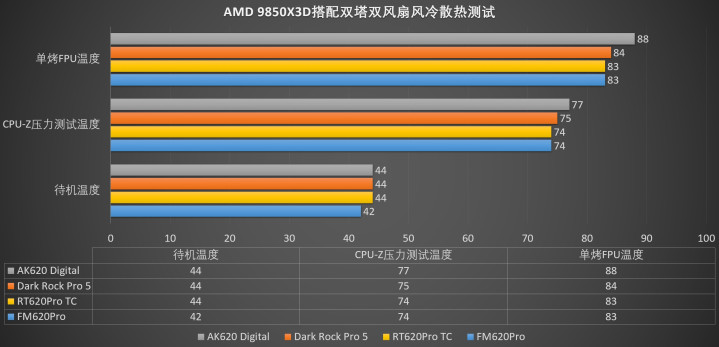 银昕的这款FM620Pro六热管双塔双电扇散热器的合座阐扬还诟谇常可以的,尤其是散热服从方面的阐扬,濒临9850X3D处治器,在室温20℃的情况下,把145W的满载功耗的中枢温度截止在83℃支配,这个阐扬很是优秀,可以让9850X3D处治器全倡导阐扬性能。