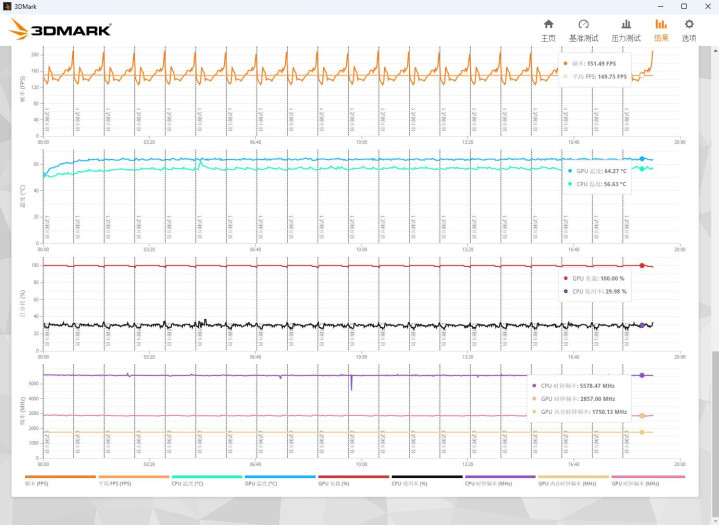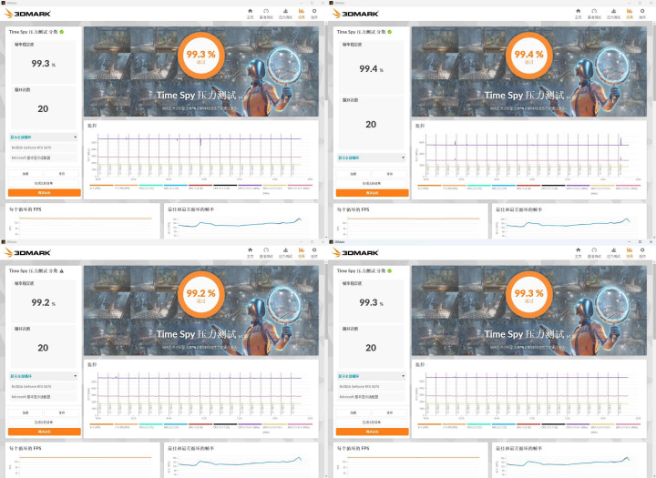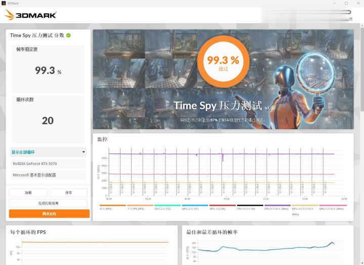 ▼简便跑个3Dmark的压力测试,TS花样,帧数踏实率在99.3%,很是踏实。