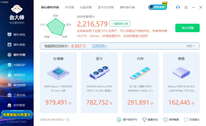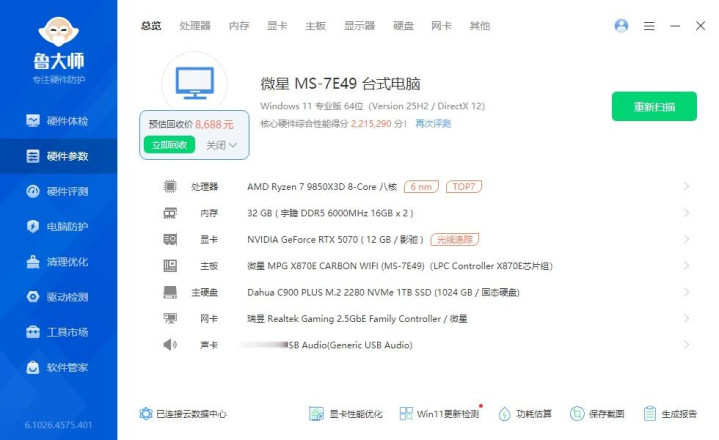▼整机建设一览,处治器是9850X3D,显卡是RTX 5070。