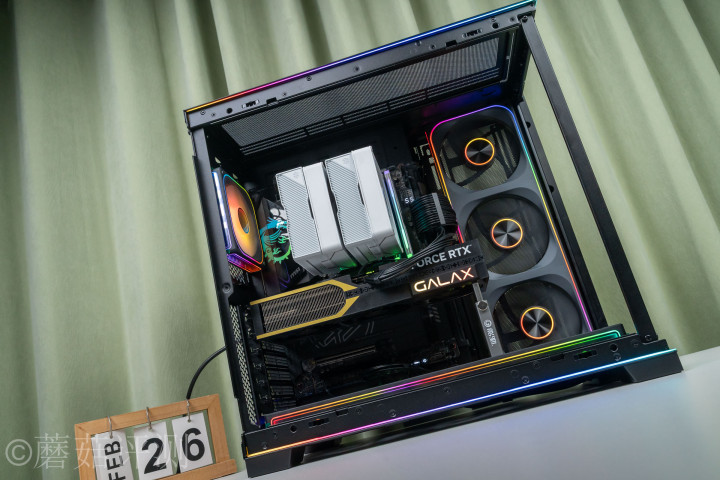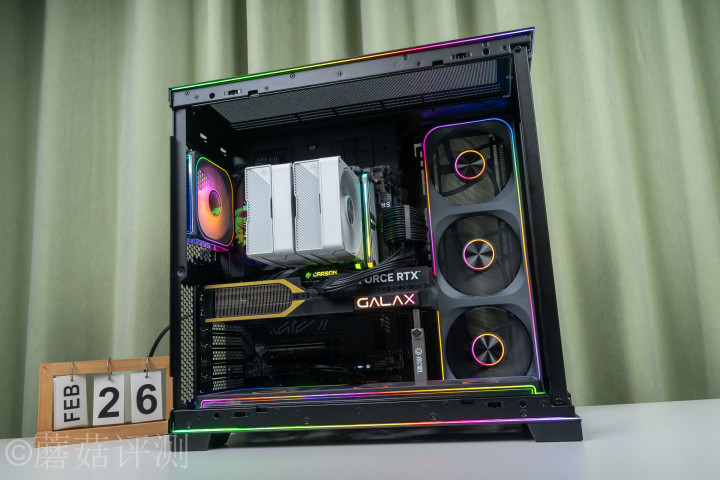 ▼机箱用的是联力的包豪斯O11D EVO RGB版海景房机箱,这款机箱,在收受经典海景房外不雅筹划打算的同期,还在顶部和底部加入了L型的RGB灯带,顶底双弧,流光溢彩。