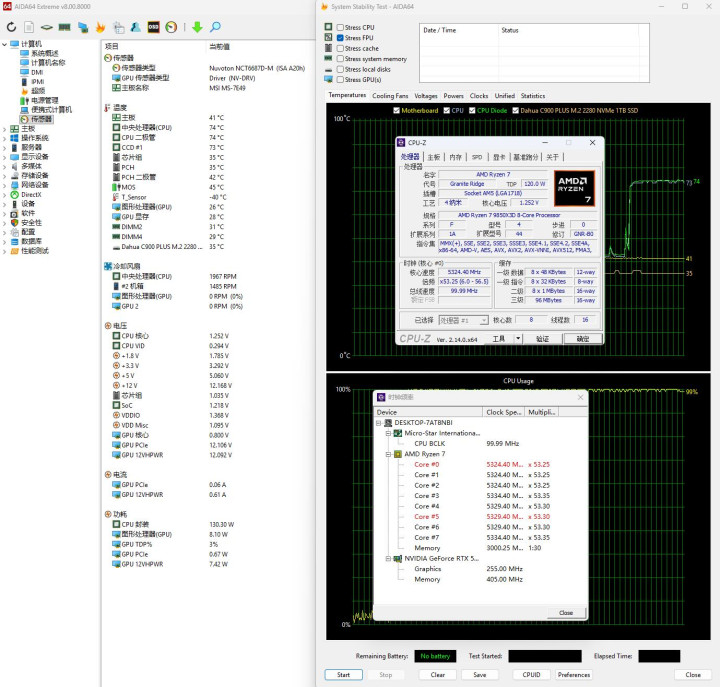 ▼跑个CPU-Z的压力测试,处治器功耗均在130W支配波动,全中枢睿频在5.3GH支配,温度方面,有一个高少许,在77℃支配,其余均在74℃支配。