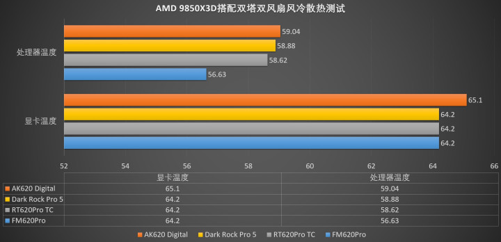 横向对比喻面,在蘑菇手里的几款双塔风冷散热器中,银昕的这款FM620Pro的阐扬基本处于首位,行为一个风冷家具并未几的品牌,一入手等于这种阐扬,还诟谇常狠恶的!