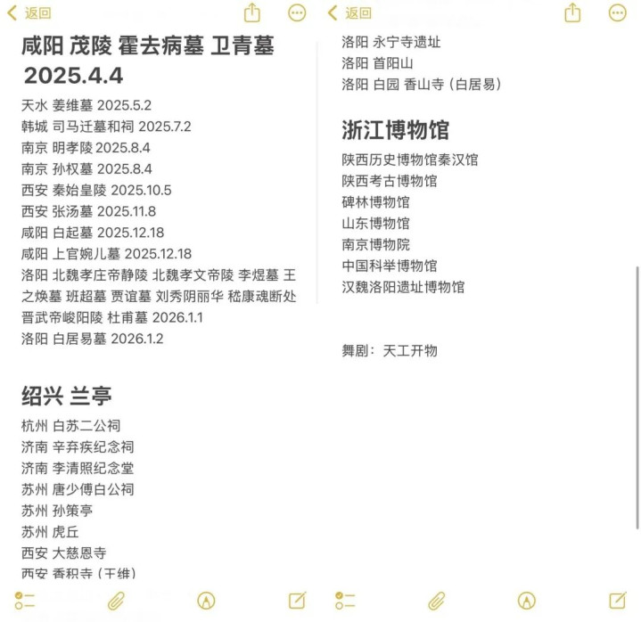 非鱼的父亲是历史竭诚,她从小浸泡在各式历史东说念主物典故里,对这些古东说念主有种自然的好奇。从旧年晴明到当今,非鱼的踪影遍布陕西、甘肃、河南、江苏。她在手机备忘录里仔细记录着每一个去过的场地:茂陵(汉武帝)、杜陵(汉宣帝)、阳陵(汉景帝)、张良墓、姜维墓、李煜墓、上官婉儿墓、司马迁祠、孙权墓……一年下来,非鱼跑遍了30多座历史东说念主物的坟茔,“惟有有时期我就去”。