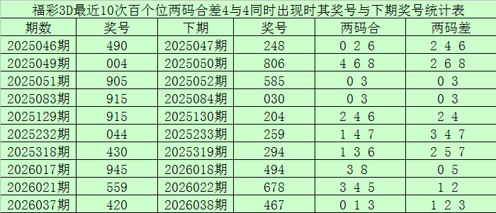 百个位合差分析:上期奖号百个位开出40组合,两码合为4,两码差为4,最近10次百个位两码合4与两码差4同时出现时,其奖号和下期奖号分别为: