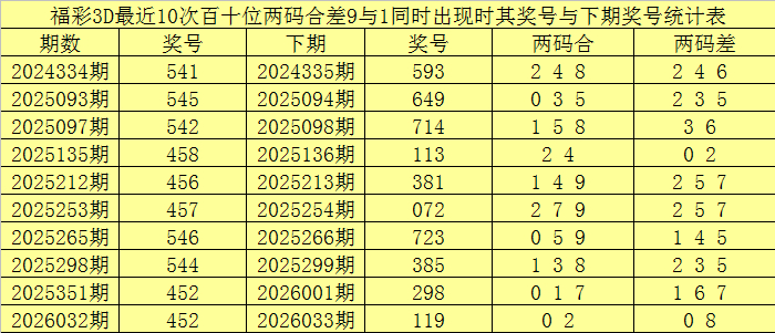 百十位合差分析:上期奖号百十位开出45组合,两码合为9,两码差为1,最近10次百十位两码合9与两码差1同时出现时,其奖号和下期奖号分别为: