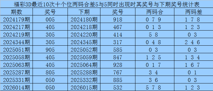 从以上统计可以看出,十个位两码合差5与5同时出现之后其下期两码合差表现最热的4个分别为:0137,本期十个位两码合差可以参考这四码中的数据。