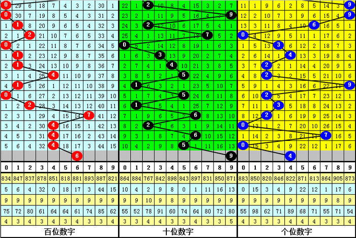 从以上统计可以看出,百十位两码合差9与1同时出现之后其下期两码合差表现最热的4个分别为:0125,本期百十位两码合差可以参考这四码中的数据。