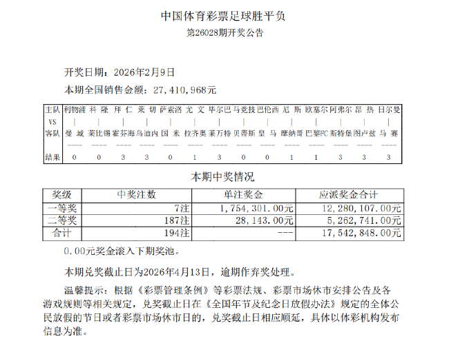 北京时间2月9日,足彩第26028期开奖结果揭晓。本期14场头奖开出7注,单注奖金1,754,301元;14场二等奖开出187注,单注奖金28,143元;任选9场开出1,400注,单注奖金9,493元。本期14场销量为27,410,968元,任九投注总额为20,767,950元。