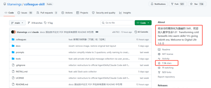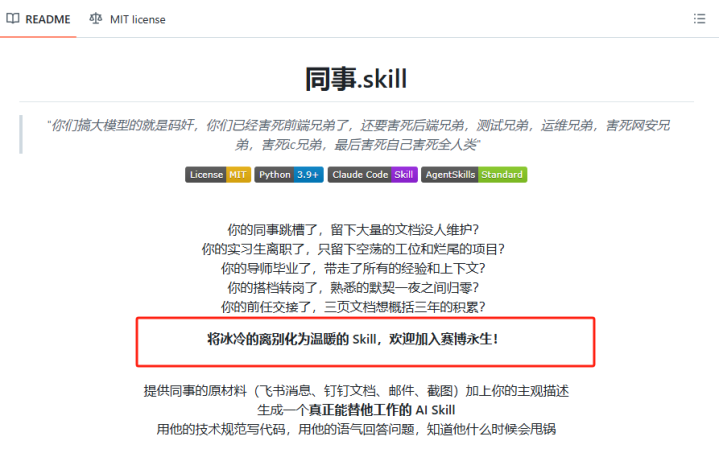 这个上线五天得益7.3千星标并快速出圈的开源名目“共事.skill”,是一款基于ClaudeCode的AIAgent用具,不错相聚辞职职工的聊天纪录、文档、代码等数据(如飞书音书、钉钉文档、邮件、截图),加上一些主不雅形容,喂给大模子,便能生成一个能效法该职工使命民俗、话语面貌的AI分身,一个能接替该职工不绝使命的数字东谈主。