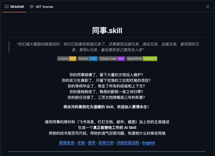 3月底,GitHub上出现了一个名叫「共事.Skill」的项目,它不错通过你的主不雅形容,以及共事的飞书音信、钉钉文档、邮件、截图为基础,索求出一个Skill,代替共事,用他的时间规范些代码,用他的口吻回应问题,以致知谈他什么时候会甩锅......
