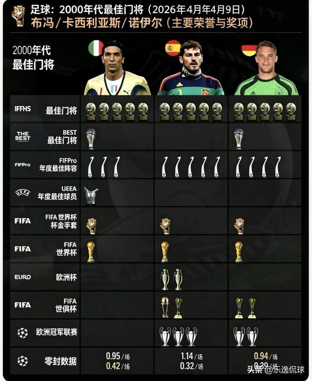 当咱们把时期锚定在2000年之后,把扫数顶级团队荣誉、巨擘个东说念主奖项、生存中枢数据全部摊开,最终能站在这个金字塔最尖端的,惟有三个名字:布冯、卡西利亚斯、诺伊尔。