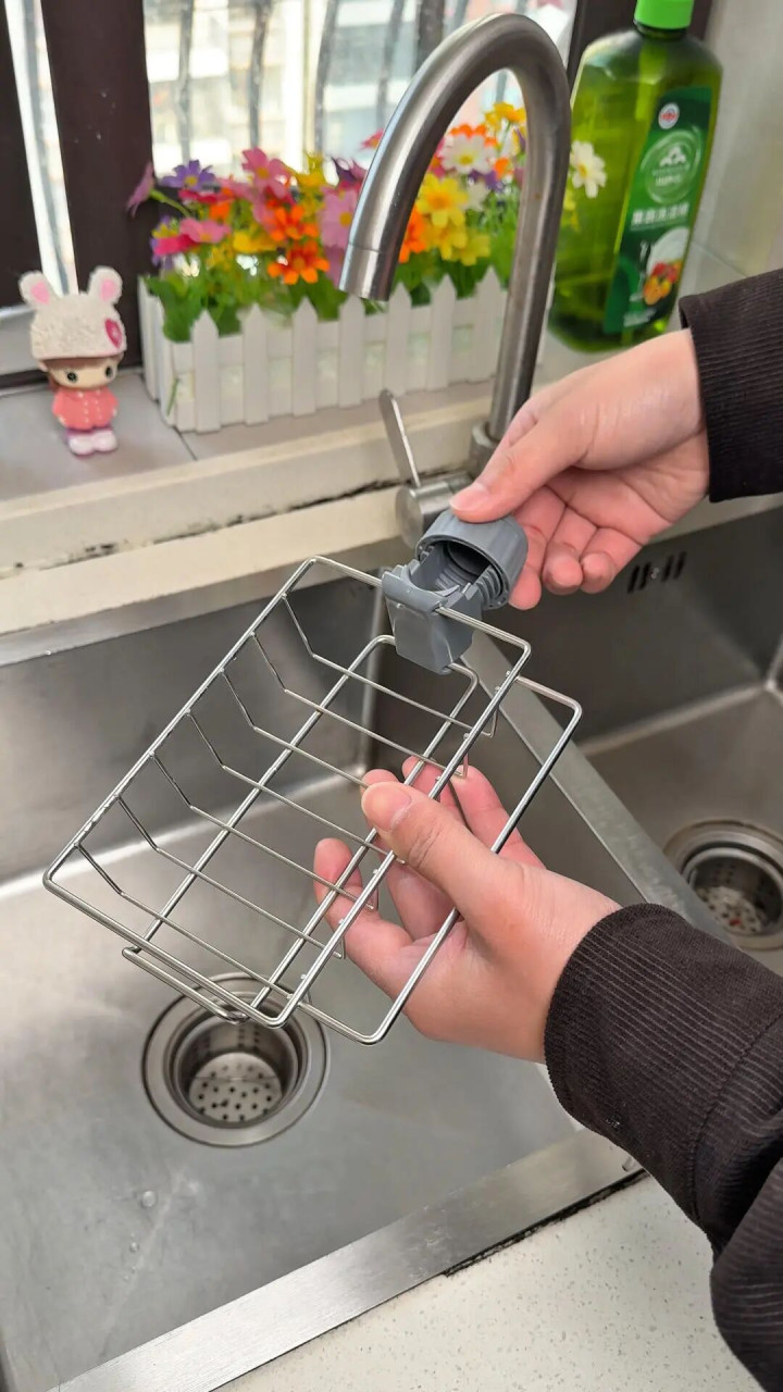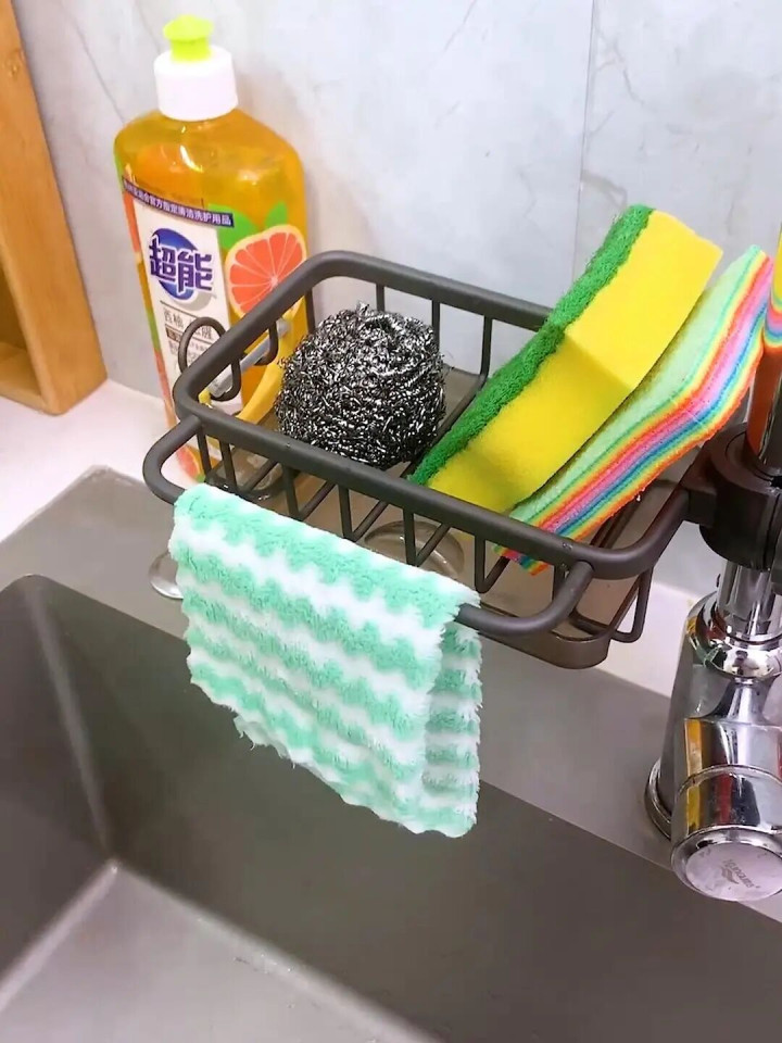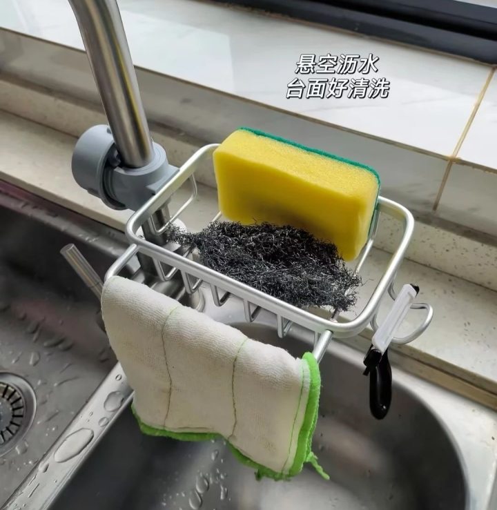 这个水槽架不错径直卡在水龙头上,免打孔,能凹凸诊治还能转。钢丝球、海绵擦、洗完东西顺遂一放,沥水快,不繁殖细菌。关键是,台面变干净了。