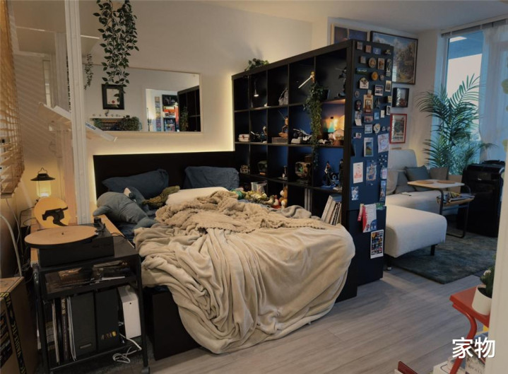 原本,放床的这位置也是客厅的空间,但如今,却用一道黑色的开放式高柜隔开,柜子上放着他喜欢的各种玩具摆件,下面也可以收纳书籍杂物,甚至可以专门留出柜格,当个睡前放水杯、手机等物的床头柜,也是颇为实用。