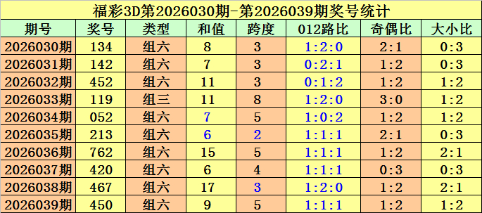012路分析:上期012路比1:1:1,相等,本期关注1路号码走冷,012比参考1:0:2。
