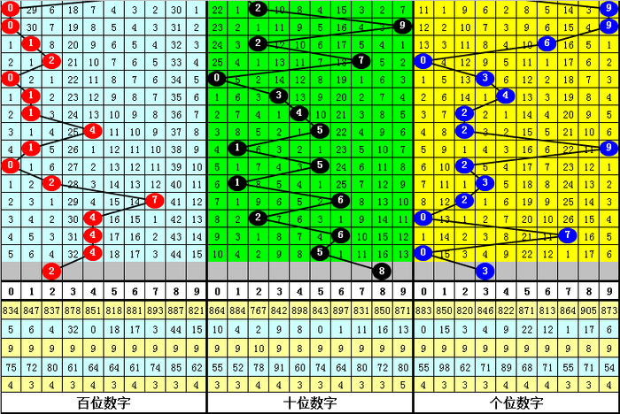 个位分析:上期奖号为0,下降7点,本期该位上升,关注3。