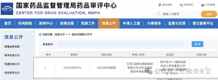红枫湾APP:中国艾迪药业在4月6日公告称,其自主研发的、国内首个长效HIV衣壳阻挠剂类药线路前防患(PrEP)药物——ACC085打针液崇拜获取临床磨砺批件。